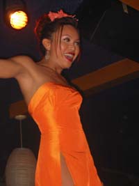 the same waitress in an orange dress. She's up on the bar doing here lip